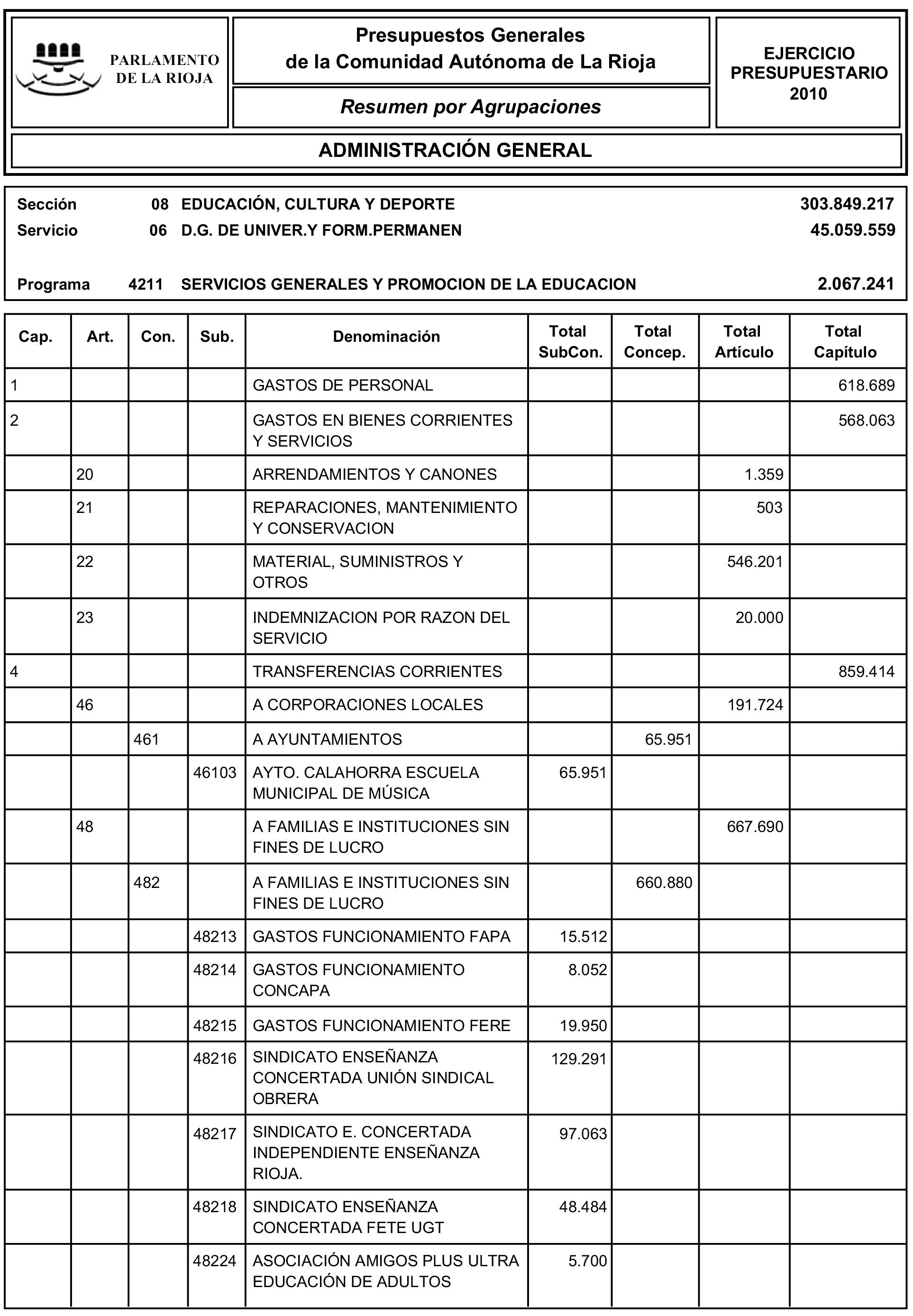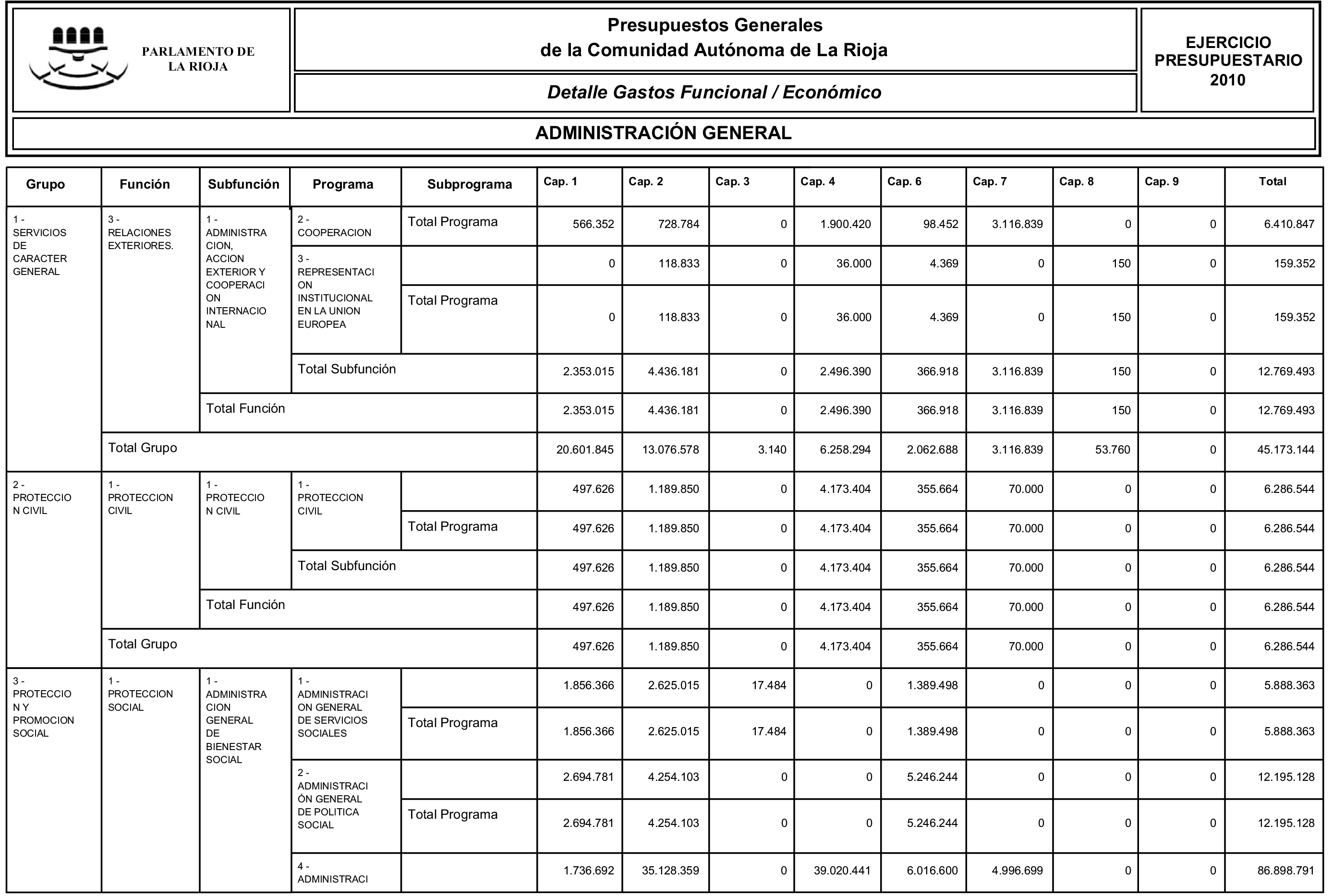 a) El presupuesto de la Administración General, en el que se integran los presupuestos del Parlamento, del Consejo Consultivo de La Rioja y de los organismos autónomos Servicio Riojano de Salud, Servicio Riojano de Empleo, Instituto de Estudios Riojanos e Instituto Riojano de la Juventud.