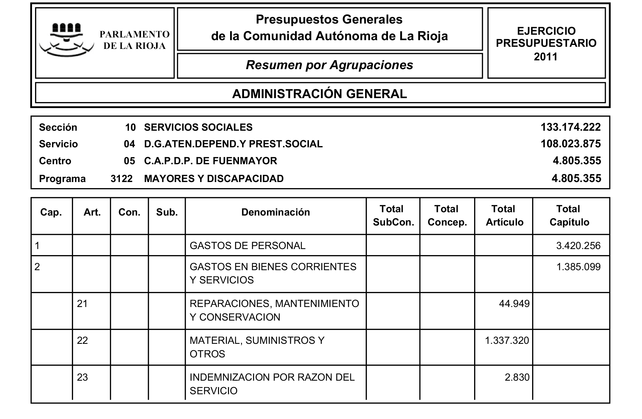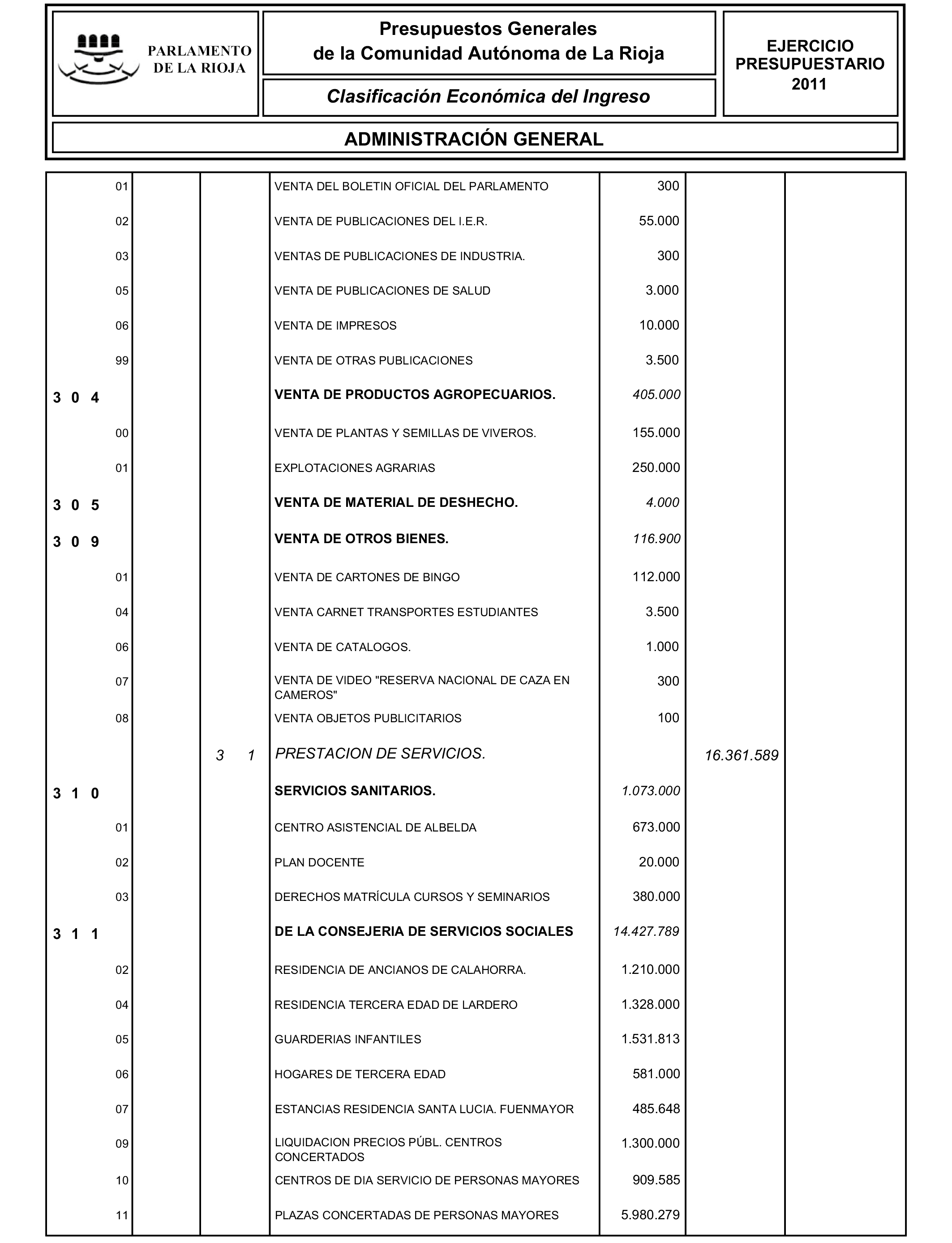 a) El Presupuesto de la Administración general, en el que se integran los presupuestos del Parlamento, del Consejo Consultivo de La Rioja y de los organismos autónomos Servicio Riojano de Salud, Servicio Riojano de Empleo, Instituto de Estudios Riojanos e Instituto Riojano de la Juventud.