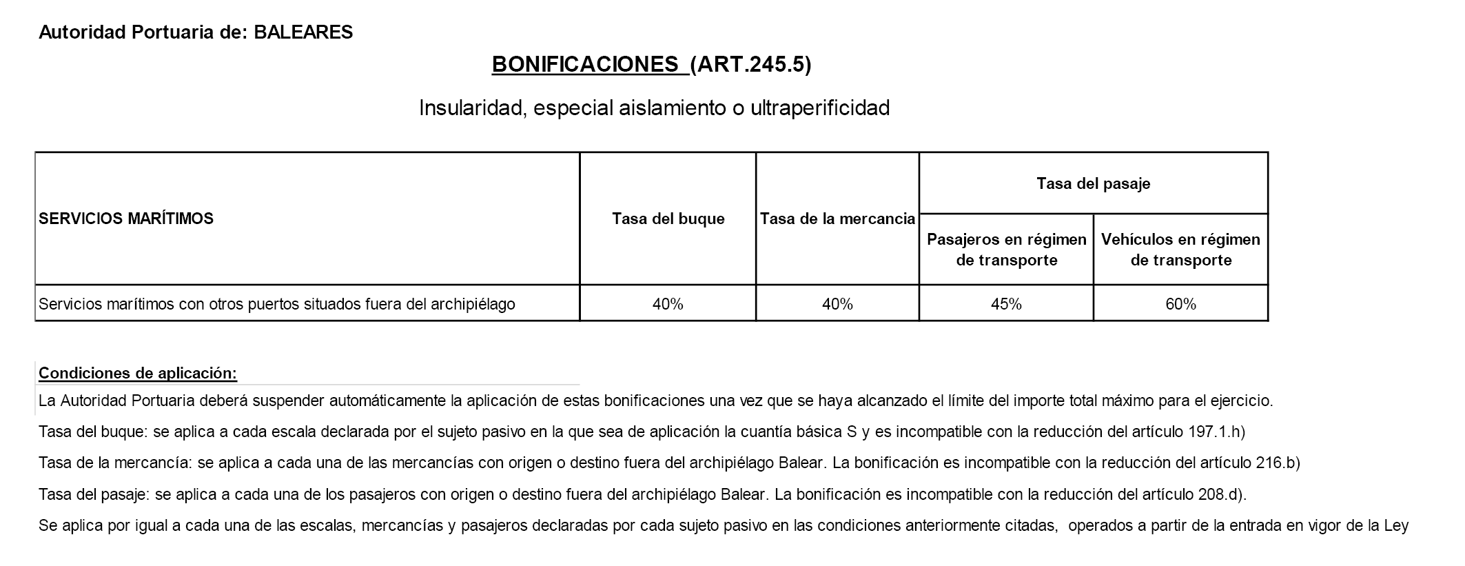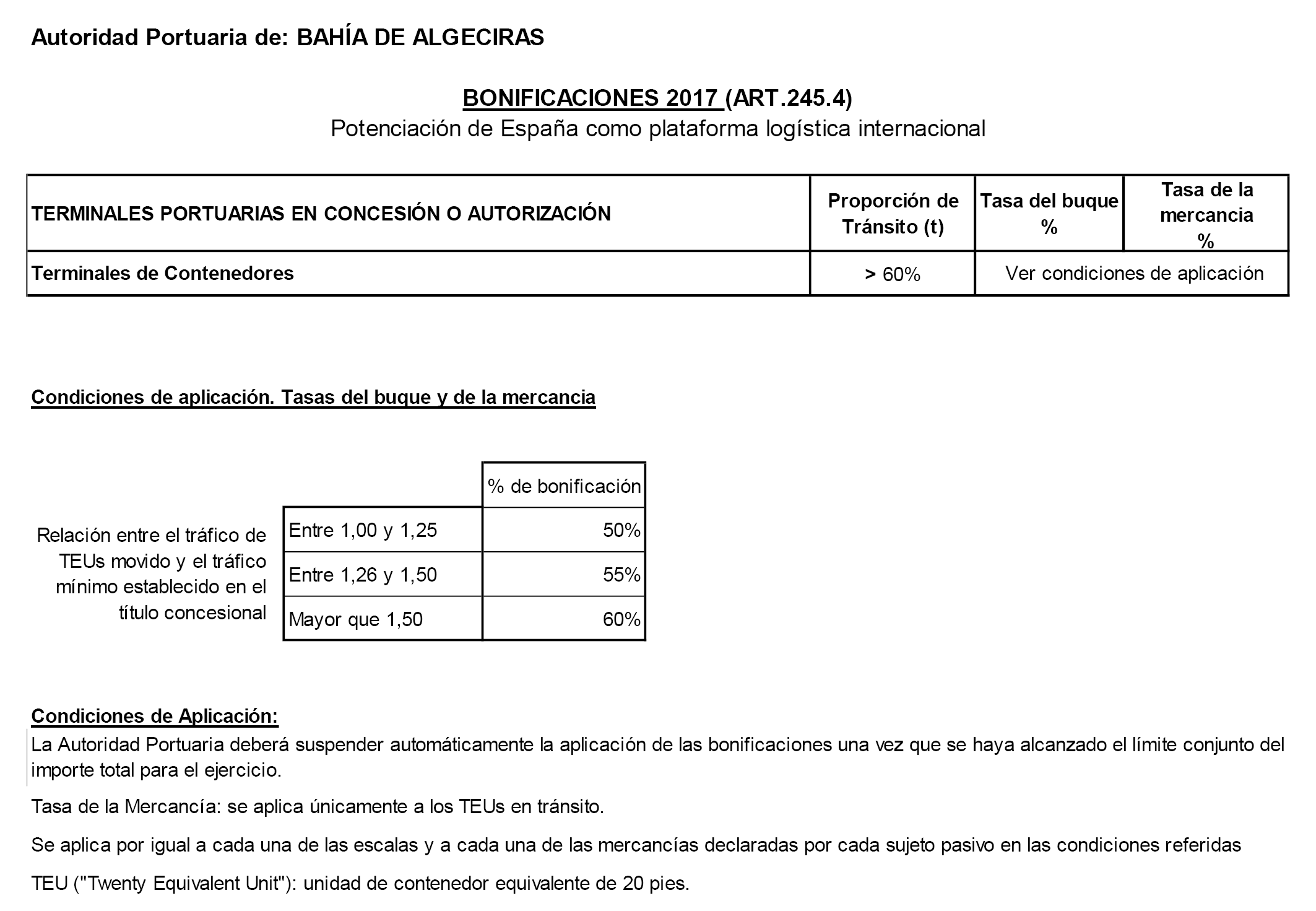 También se mantienen para 2017 las cuantías básicas de las tasas portuarias. Se establecen las bonificaciones y los coeficientes correctores aplicables en los puertos de interés general a las tasas de ocupación, del buque, del pasaje y de la mercancía, de acuerdo con lo dispuesto en el texto refundido de la Ley de Puertos del Estado y de la Marina Mercante, aprobado por el Real Decreto Legislativo 2/2011, de 5 de septiembre.