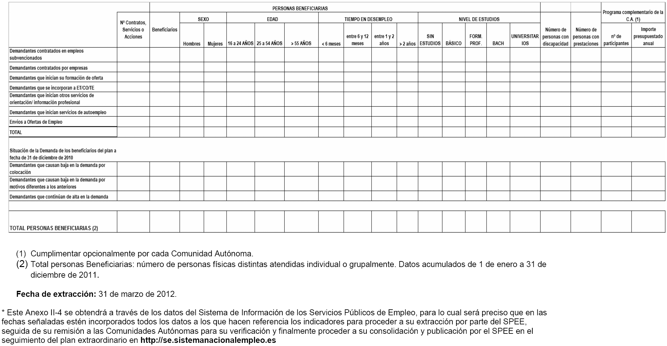 En concreto en el anexo II-2, se incorpora en el presente ejercicio la necesidad de informar sobre el número de personas atendidas incluidas en los diferentes colectivos que son objeto de especial atención de acuerdo a lo establecido en los artículos 2.6 y 3.3 del Real Decreto-ley 1/2011, de 11 de febrero, de medidas urgentes para promover la transición al empleo estable y la recualificación profesional de las personas desempleadas. Todo ello sin perjuicio de lo que se establezca en el protocolo de coordinación mencionado en el artículo 3.2 del mencionado Real Decreto-ley.