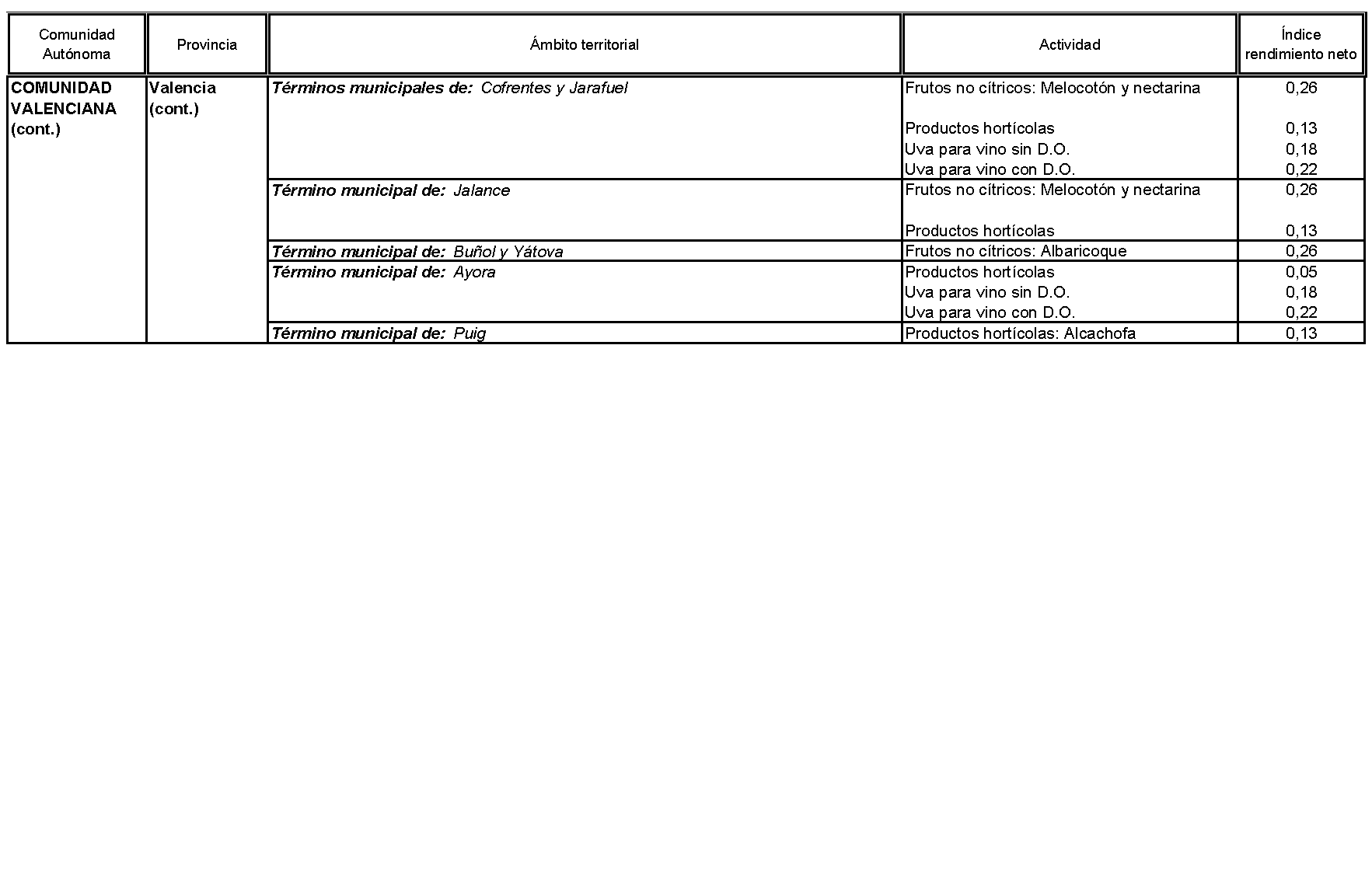 Los índices de rendimiento neto aplicables en 2015 a las actividades agrícolas y ganaderas desarrolladas en los ámbitos territoriales definidos en el anexo de la presente Orden serán los contenidos en éste.