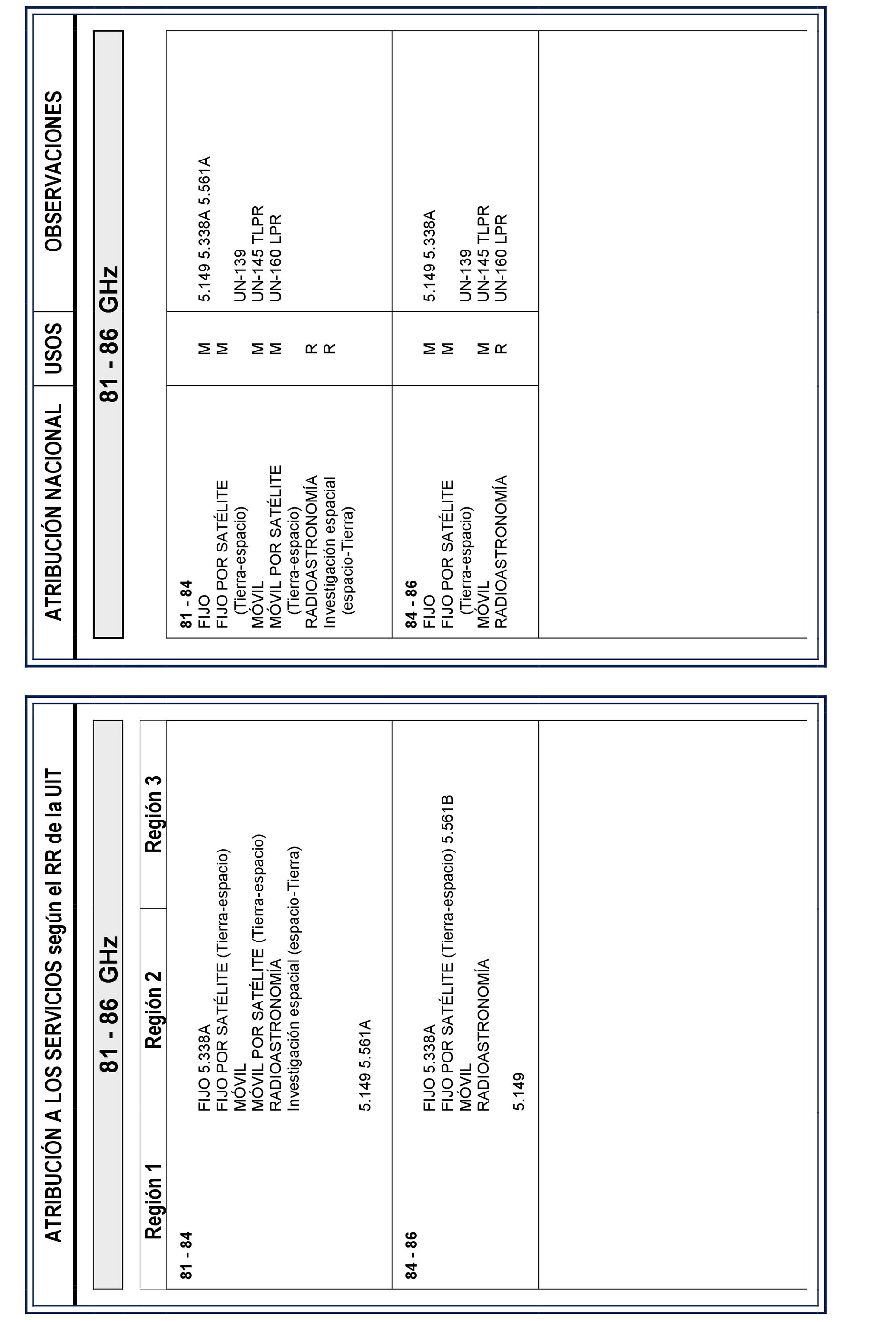 El cuadro que se inserta a continuación comprende en primer lugar las notas del Artículo 5 del Reglamento de Radiocomunicaciones (RR) que complementa la Constitución y el Convenio de la Unión Internacional de Telecomunicaciones (UIT), seguidas de las tablas de atribución de bandas de frecuencias según dicho artículo, esta atribución se indica para las tres regiones en las que la UIT ha dividido el mundo a efectos de atribución de bandas de frecuencias según la nota 5.2 del RR.