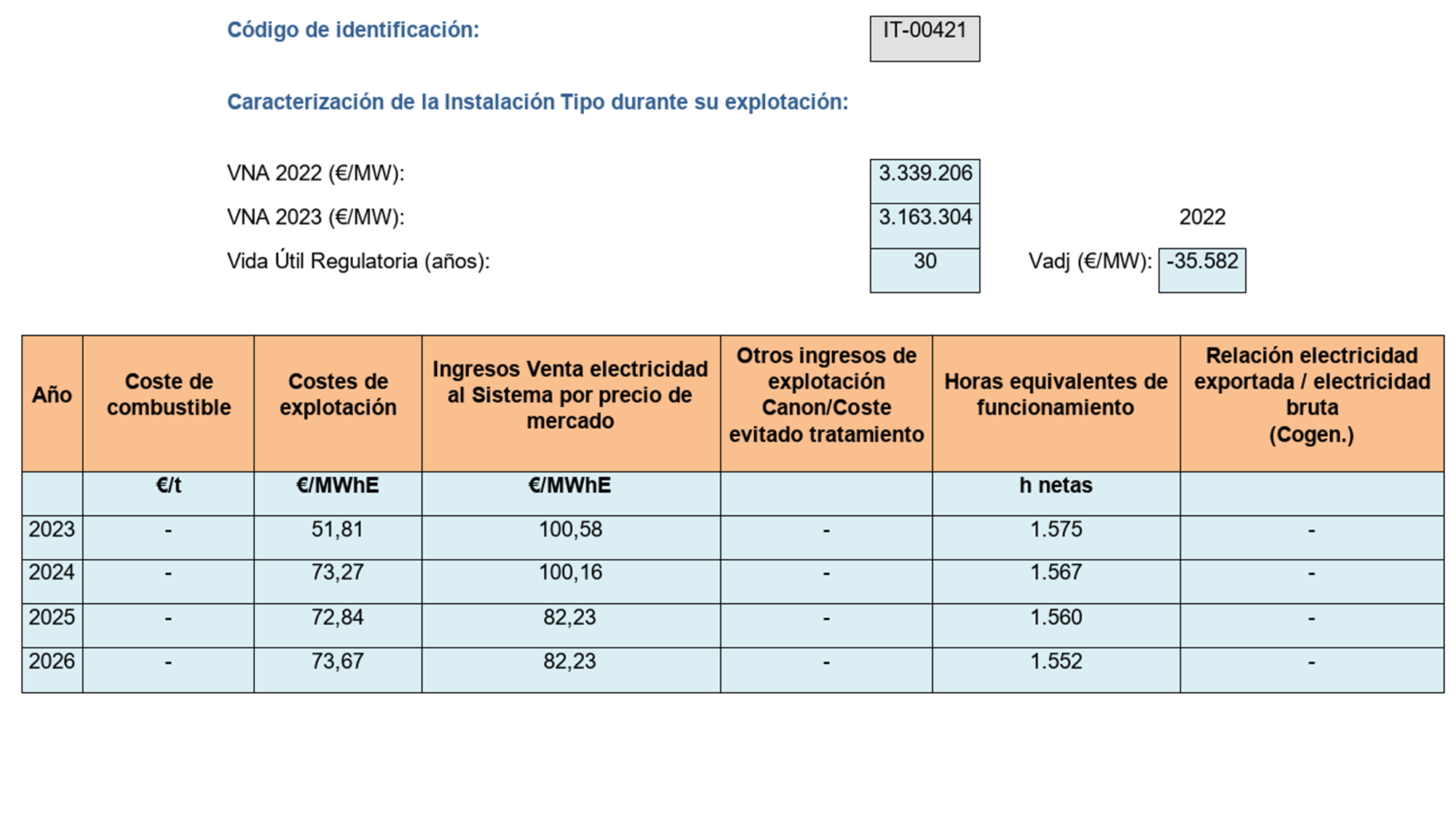 s) Orden TED/1295/2022, de 22 de diciembre, por la que se establecen los valores de la retribución a la operación correspondientes al segundo semestre natural del año 2022, aplicables a determinadas instalaciones de producción de energía eléctrica a partir de fuentes de energía renovables, cogeneración y residuos.
