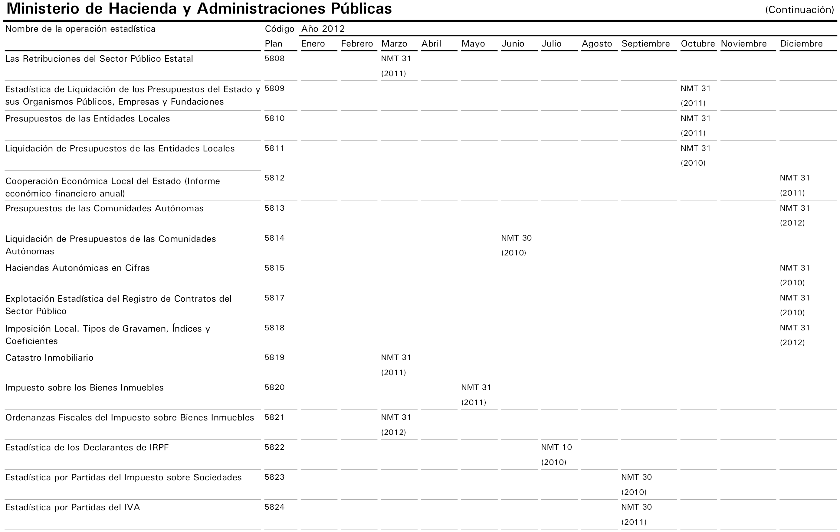 5. En el anexo V se facilita el calendario de difusión de las operaciones estadísticas que van a publicar resultados en 2012 por organismo responsable de su ejecución.