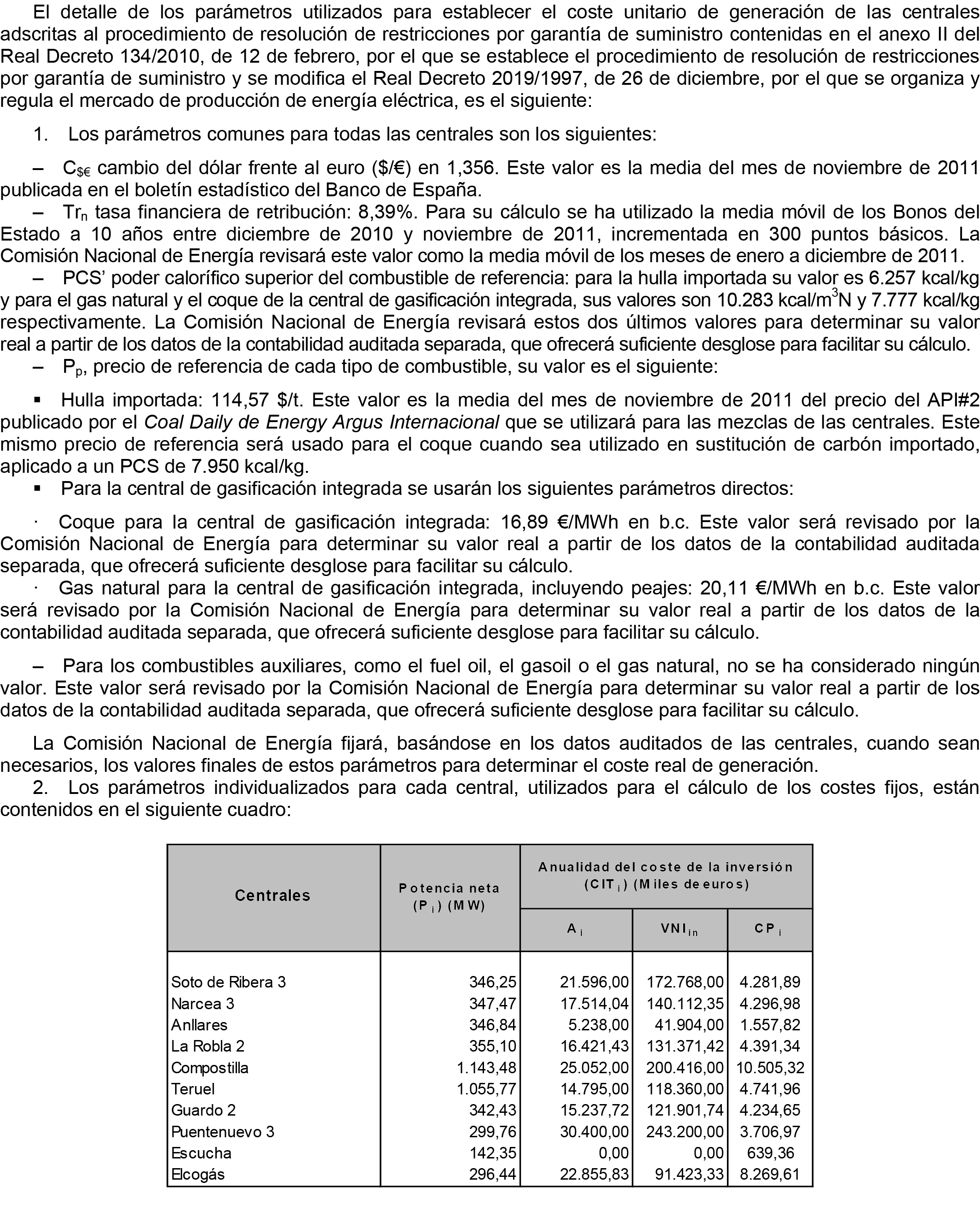 2. De conformidad con lo establecido en el anexo II del Real Decreto 134/2010, de 12 de febrero, los parámetros contenidos en los anexos de la presente resolución serán revisados por la Comisión Nacional de Energía. A estos efectos la Comisión Nacional de Energía determinará el coste real de aquellos parámetros fijados en los anexos de esta resolución que requieran de los datos de la auditoría de las centrales.